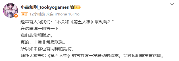 近日,小高和刚在微博上发文回应了有关《第五人格》联动相关的小高下官问题 。